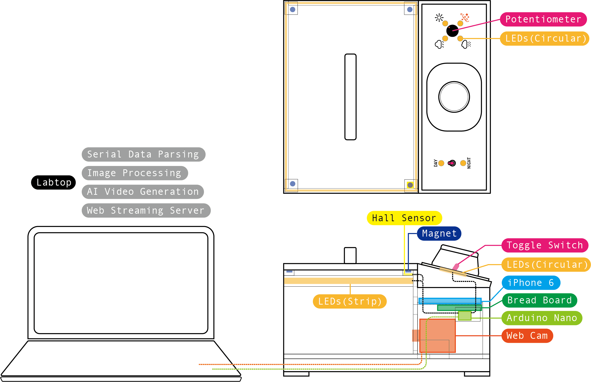 The laptop serves as the central processing hub. It receives sensor data from Arduino via Serial Communication, triggers a frame capture using OpenCV, and transforms that image into a dynamic video through the Kling v2.5 Turbo Generative AI API(Replicate AI). The final output is then streamed via Flask web server to an iPhone 6 integrated within the device for real-time viewing