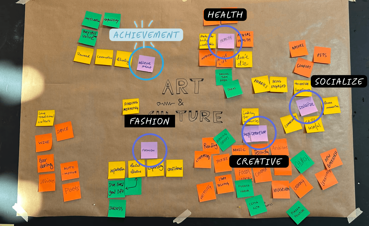 As the first step of the project, we conducted mind mapping related to this topic, allowing us to identify key factors that should be considered in the relationship between the elderly, art, and culture. Through this process, we found the theme of accomplishment particularly interesting.