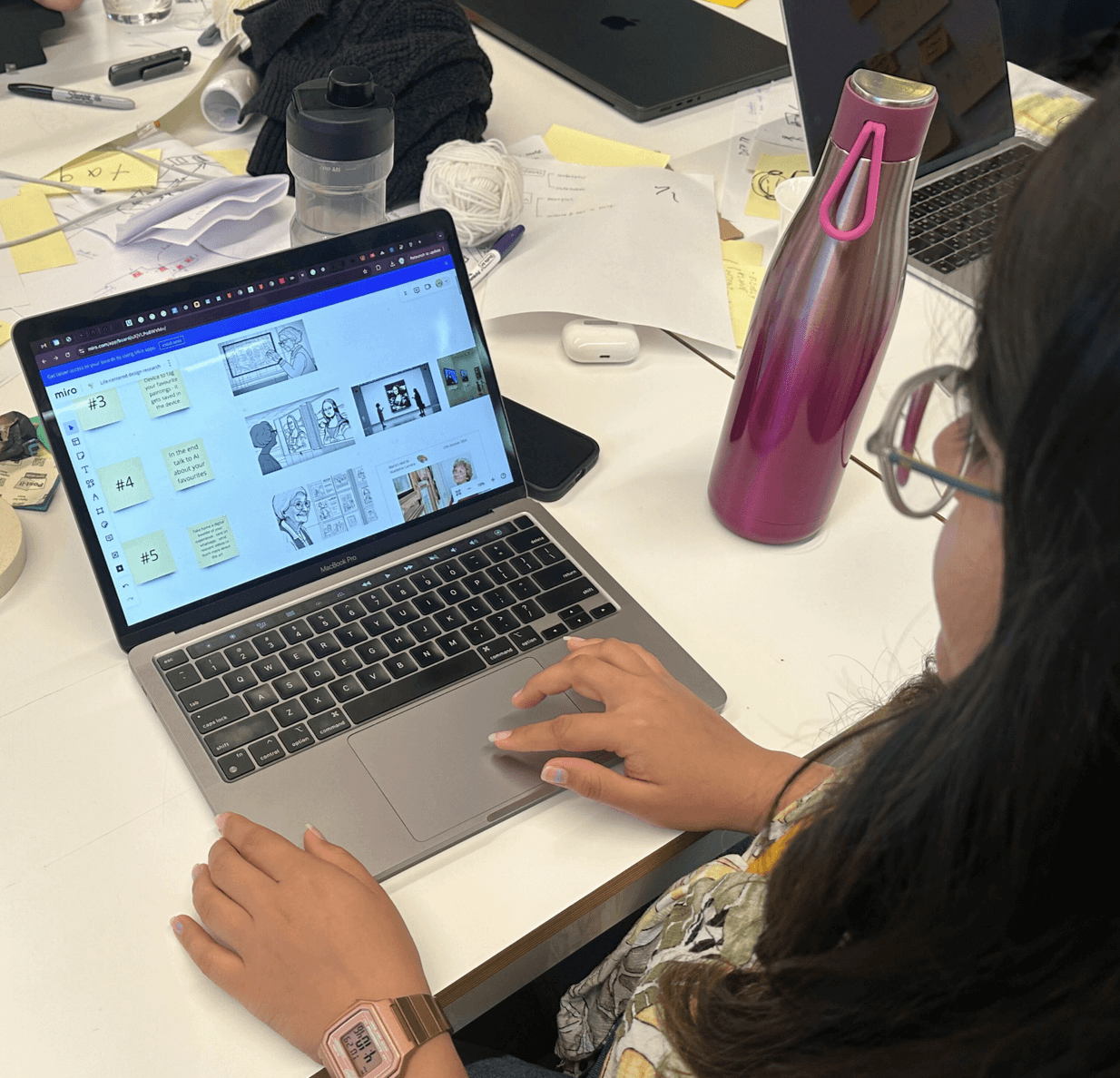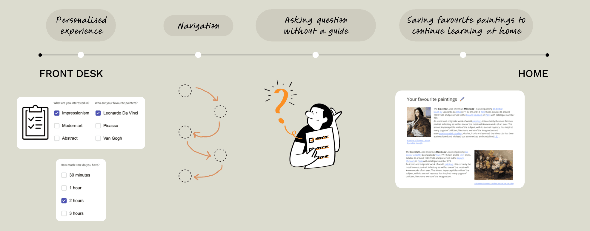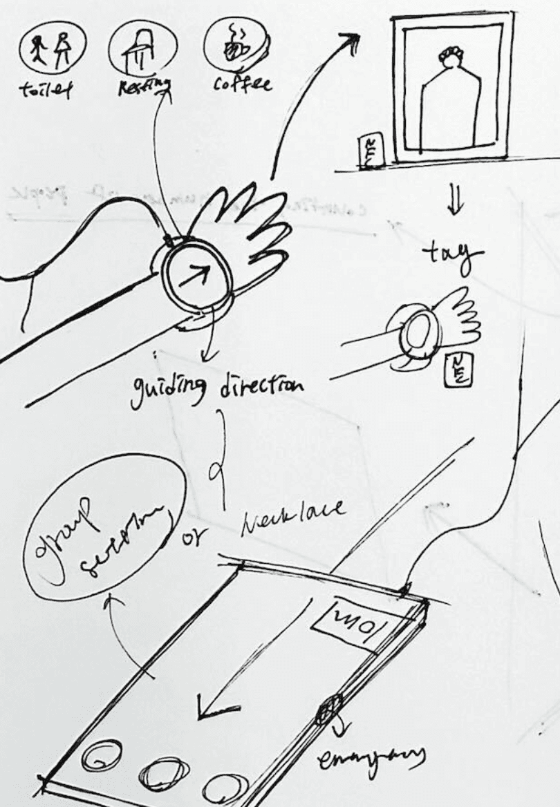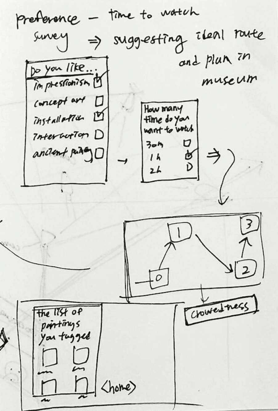 Based on the insights gathered from interviews and the 'How Might We' (HMW) questions defined for our design direction, we proceeded with ideation sketches. Our brainstorming focused on ideas that enable seniors to navigate museums or art galleries at their own pace and according to their interests, while providing opportunities for deep learning about specific artworks