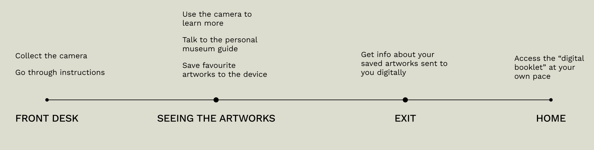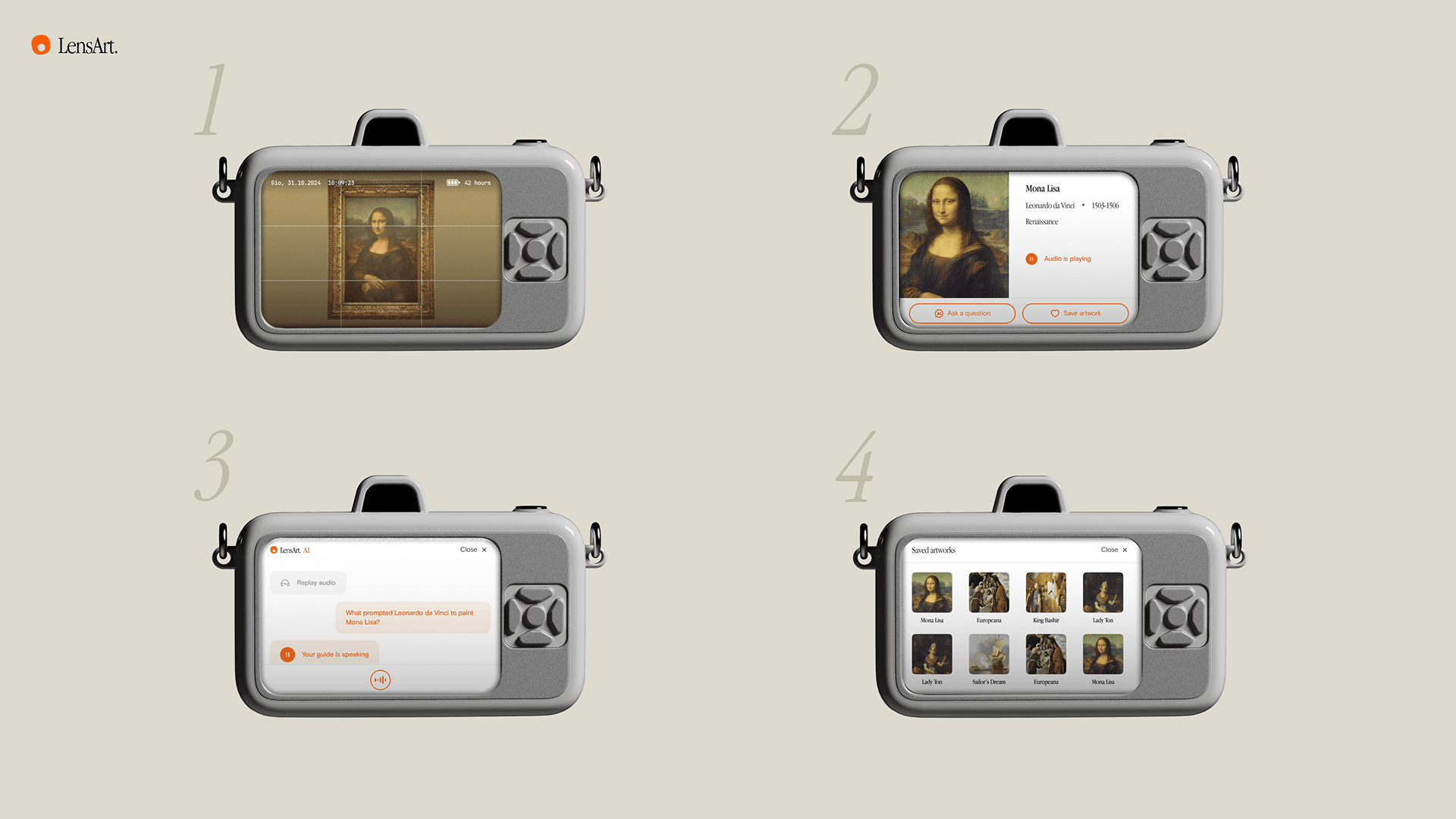 We conducted extensive research, including interviews and observations, to explore the relationship between elderly and art and culture. Through this process, they discovered that elderly people wish to deeply engage with art but face challenges such as physical fatigue, lack of seating, and fast-paced museum tours. As a solution, they designed an AI-powered, camera-like device that allows users to save artworks, access real-time information, and learn through personalized audio and visual guides. Additionally, the project considered the pre-visit, visit, and post-visit experiences, incorporating features like personalized navigation routes, AI guides, and digital booklets.