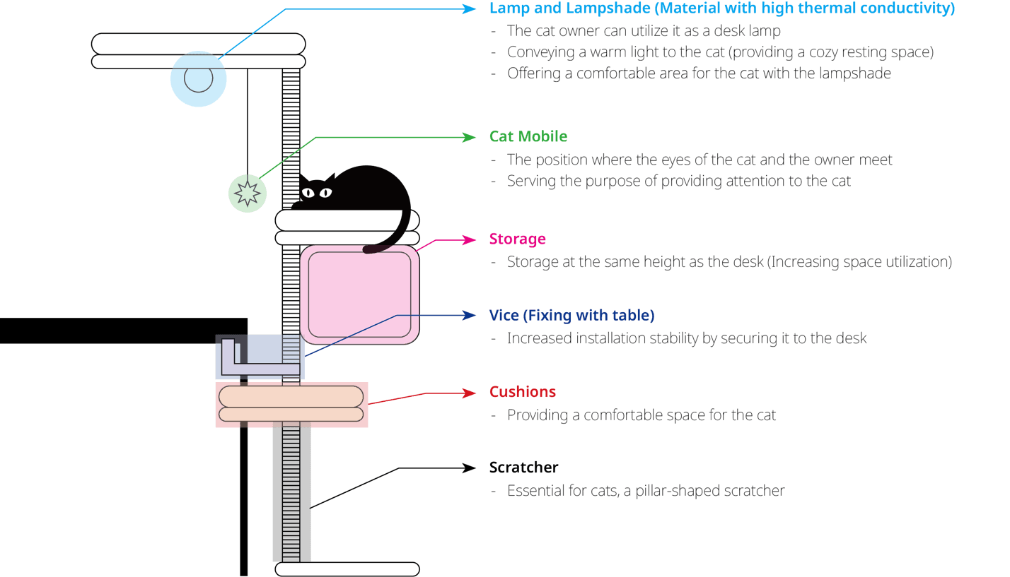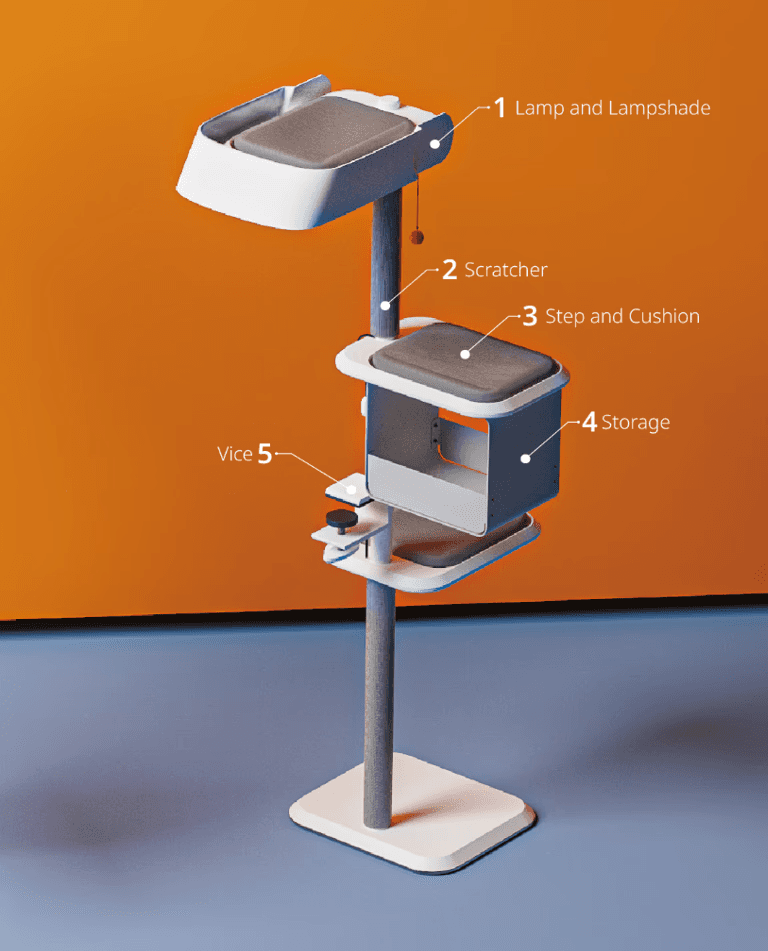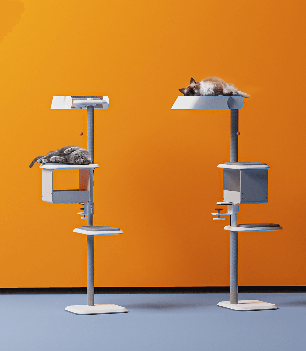 When sitting at my desk to work, there are occasions where my cat climbs onto the desk and disrupts my tasks. In recent times, with the increase in single-person households, there is a growing trend of people raising cats to alleviate loneliness. Drawing inspiration from this situation, I designed a cat tower that allows owners and their cats to share the same desk space, enabling them to work or study together.