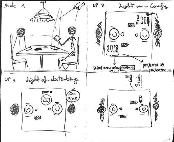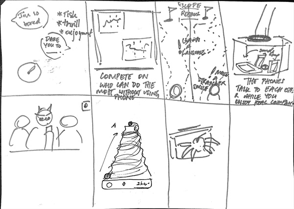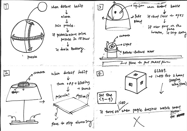 Based on the three elements above, we focused on diverting attention as a way to hinder the habit and sketched various ideas. Through the sketches, we identified various contexts of aimless smartphone immersion and decided to focus on situations where people look at their smartphones instead of paying attention to their partners during meal times. We then decided to design a 'dining experience' to address this bad habit.